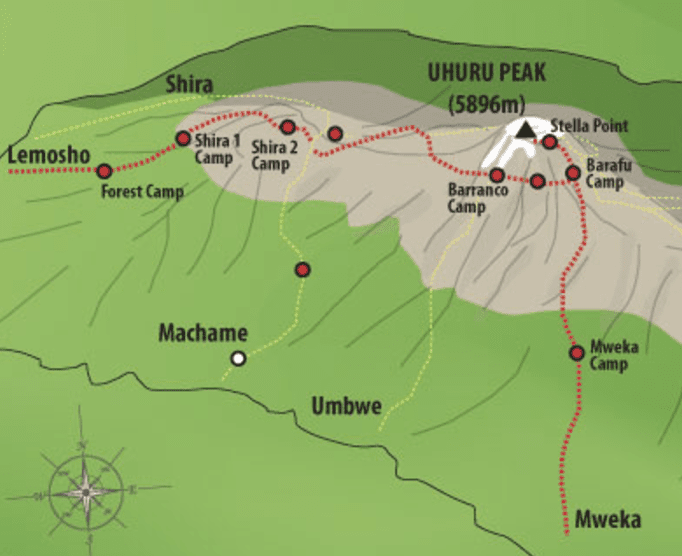 Tu guía llega al hotel por la mañana y te lleva en coche durante cuatro horas hasta la entrada oeste del Parque Nacional Kilimanjaro (2200 m). El camino atraviesa una hermosa selva tropical. Al llegar al punto de partida (3500 m), disfrutas por primera vez de unas vistas impresionantes de la meseta de Shira. La ruta a pie hasta el primer campamento es bastante llana, lo que facilita que tu cuerpo se aclimate a la altitud.