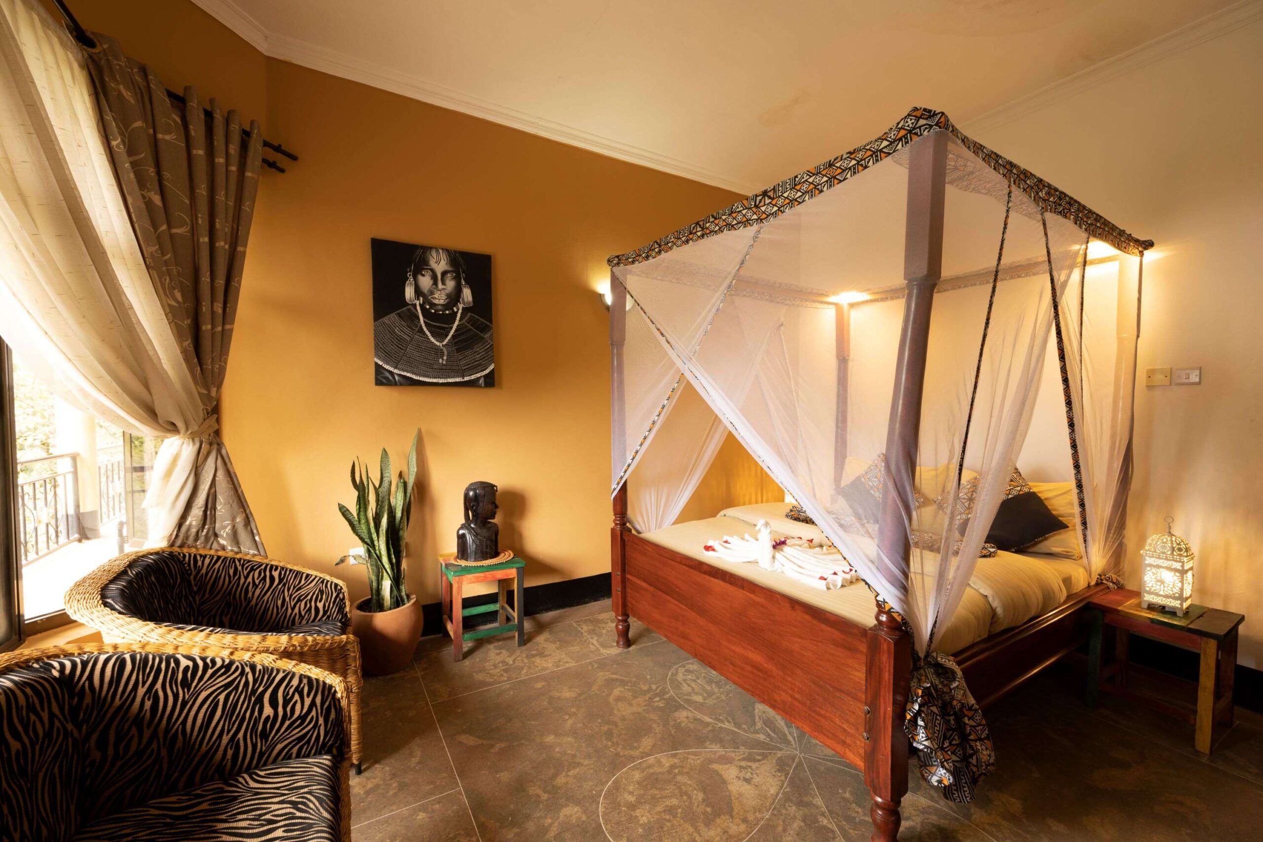 Africa Safari Arusha es un alojamiento acogedor situado a las afueras de la ciudad de Arusha, en el tranquilo pueblo de Sakina, a los pies del Monte Meru. Dispone de ocho habitaciones estándar en el edificio principal y de ocho habitaciones lujosas repartidas en cuatro edificios individuales y circulares. Todas tienen una decoración tradicional africana, una sala de estar, un cuarto de baño y grandes ventanales que inundan de luz natural el espacio. En sus exuberantes jardines podrás darte un baño en la piscina o disfrutar de una bebida refrescante o de una comida en el bar y el restaurante del establecimiento. En definitiva, es el lugar ideal para relajarse después de un safari.