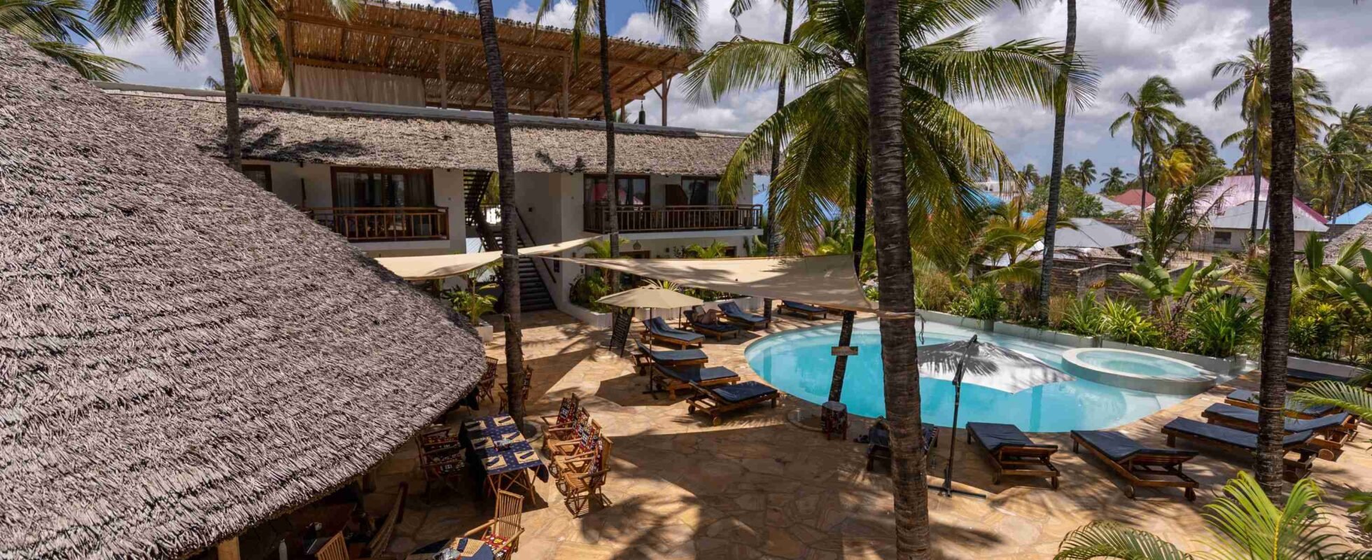 Aluna Paje es un nuevo alojamiento en el corazón del animado centro de Paje. Aluna se caracteriza por ofrecer un trato personal, un buen servicio y unas habitaciones cómodas a un precio asequible. Aquí te sientes como en tu segunda casa. El hotel está construido con una arquitectura europea y combina a la perfección un diseño moderno con detalles tradicionales africanos, todo ello en un entorno natural y verde. Alrededor de la piscina, hay numerosas tumbonas y un bar con una extensa carta de bebidas refrescantes, a la sombra de unas palmeras enormes. En el restaurante, su grupo de chefs te prepara todo tipo de comidas deliciosas y, por último, en la terraza de la azotea, encuentras unas vistas inmejorables del océano y el pueblo de Paje. ¡No te puedes perder los atardeceres desde aquí!