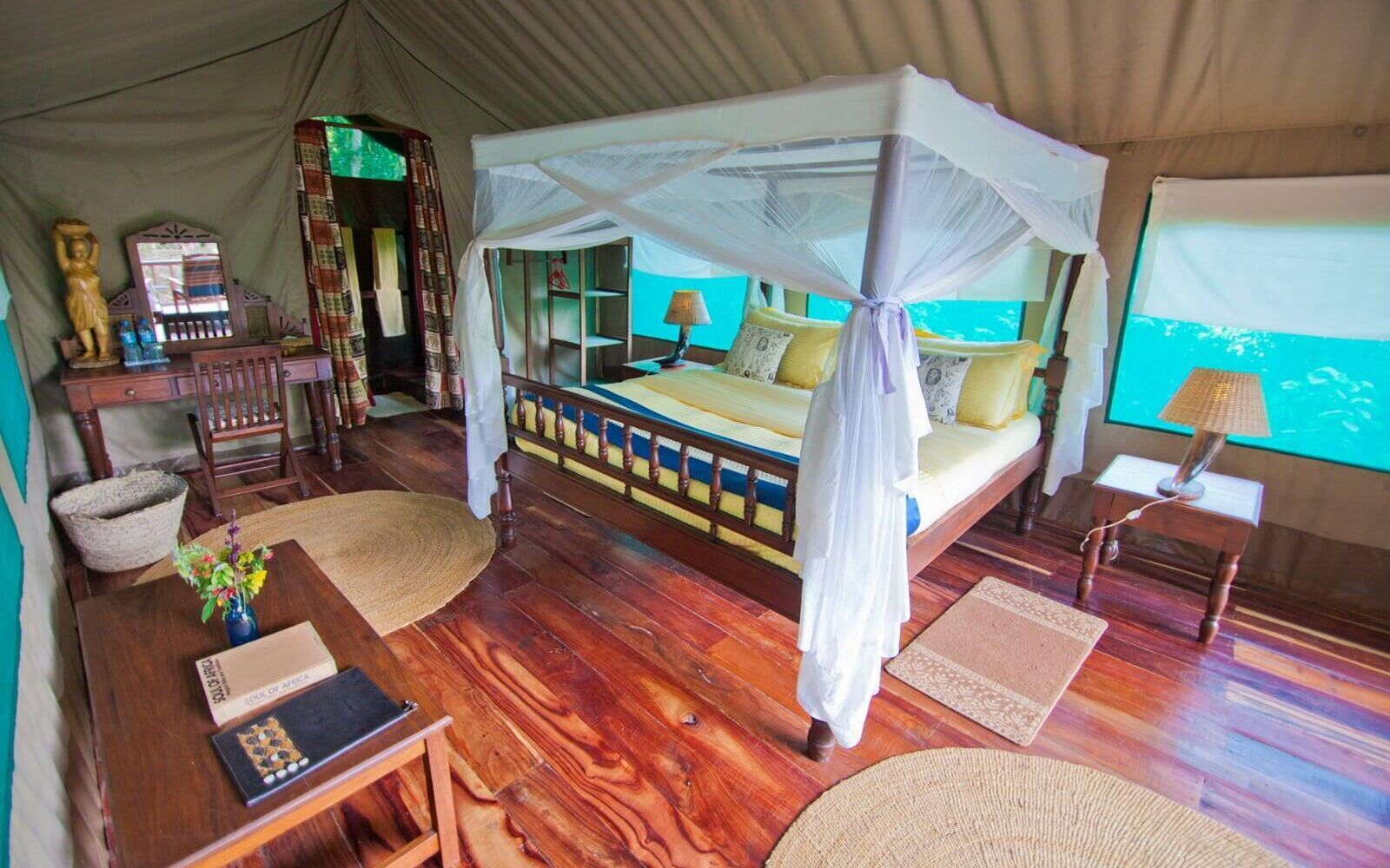 En el Parque Nacional de Gombe Stream, a la sombra de antiguos mangos, se encuentra el Mbali Mbali Gombe Lodge, un alojamiento con siete tiendas de safari de lujo con techos ondulados, vistas al lago Tanganica y separadas entre sí para garantizar la máxima privacidad posible. Cada tienda cuenta con cuarto de baño privado, camas grandes y un balcón paradisíaco con una pequeña mesa y sillas de safari. Relájate y disfruta de cómo el sol se esconde tras del lago cada tarde, mientras recuerdas la increíble ruta de senderismo que has hecho durante el día, en busca de chimpancés. En la sala de recepción, construida sobre pilotes en la playa, hay un bar, un salón, una biblioteca y un comedor. Puedes cruzar el lago utilizando el embarcadero y relajarte junto a la playa en una de sus cómodas tumbonas.