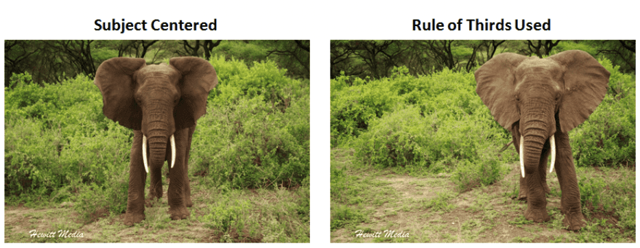 En mi ejemplo de abajo, he tomado dos fotos del mismo elefante que encontramos durante un safari en el Parque Nacional del Lago Manyara, en Tanzania. En la toma de la izquierda, capturé al elefante en el centro del encuadre. En la de la derecha, he seguido la Regla de los tercios y he colocado al elefante en el tercio derecho de la toma. Juzga tú mismo cuál de las dos fotografías es más atractiva visualmente.