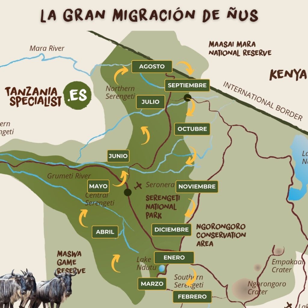 La migración suele empezar entre finales de noviembre y principios de diciembre, cuando las manadas de ñus llegan al sur del Parque Nacional del Serengueti en Tanzania, más concretamente a la zona de Ndutu.