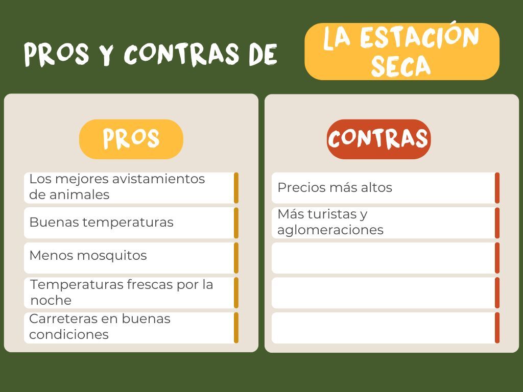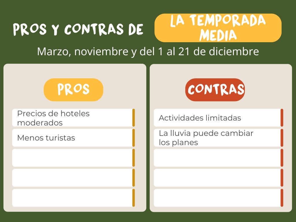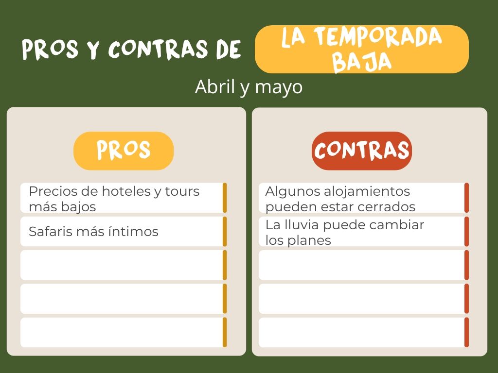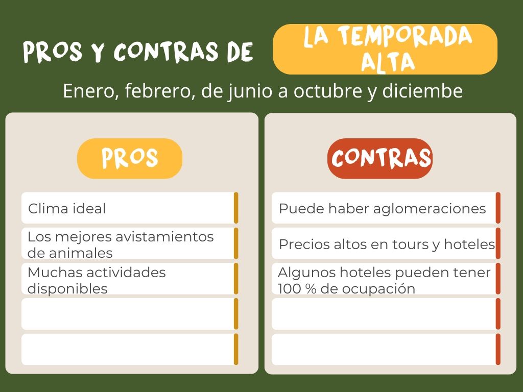 La temporada media ofrece un equilibrio entre las temporadas alta y baja, lo que la convierte en una gran opción para los viajeros que buscan precios moderados y menos aglomeraciones sin comprometer demasiado el tiempo y los avistamientos de fauna.