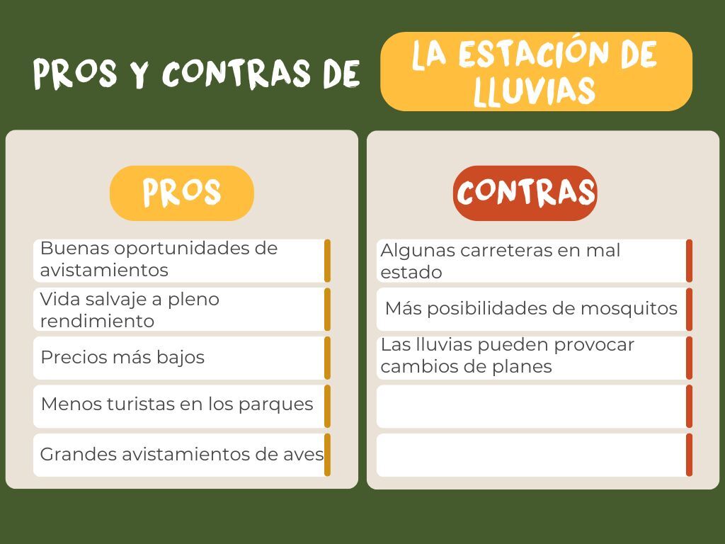 La estación de lluvias, también conocida como estación húmeda, ofrece una experiencia diferente, pero no por ello peor. Encontrarás la naturaleza en su máximo esplendor, con paisajes verdes, flores y siendo la mejor época para el avistamiento de aves. Tendrás precios más bajos y menos aglomeraciones en los parques, creando una experiencia de safari más privada.